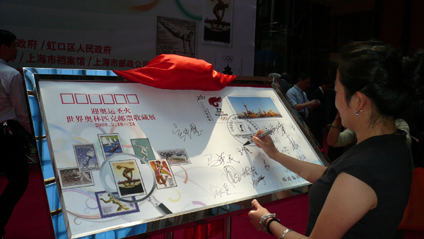 Li Jia in Shanghai with the Olympic Stamp Exhibition