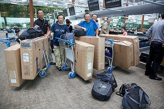 Finally, we packed all of our bikes into boxes and went to the airport. We encountered two major problems on our trip back. The first was somewhat expected: our luggage was too heavy. Each passenger was allowed 20 kilos, and our bikes are 18 kilos each! We tried to carry on all of our heavy luggage, and since we were 7 passengers, and only 6 bikes (we left Fei Xuan's bike behind), we thought we might sneak by. Altogether, we were still 70 kilos over the limit, which was going to cost us over 1500 USD! Luckily we arrived early enough and after about an hour of bargaining (and showing them our picture in the day's newspaper!) they finally let us slide by without spending a dime (editors note -- according to Dawey, Jesse was very instrumental in achieving this result -- shall we say charming the lady in charge of luggage!).